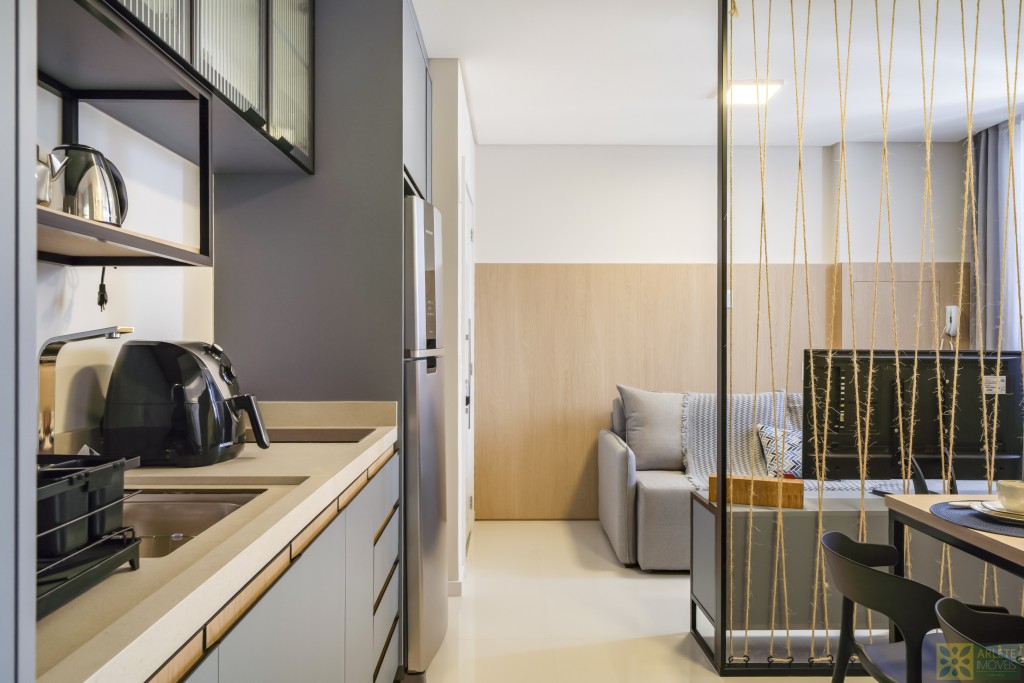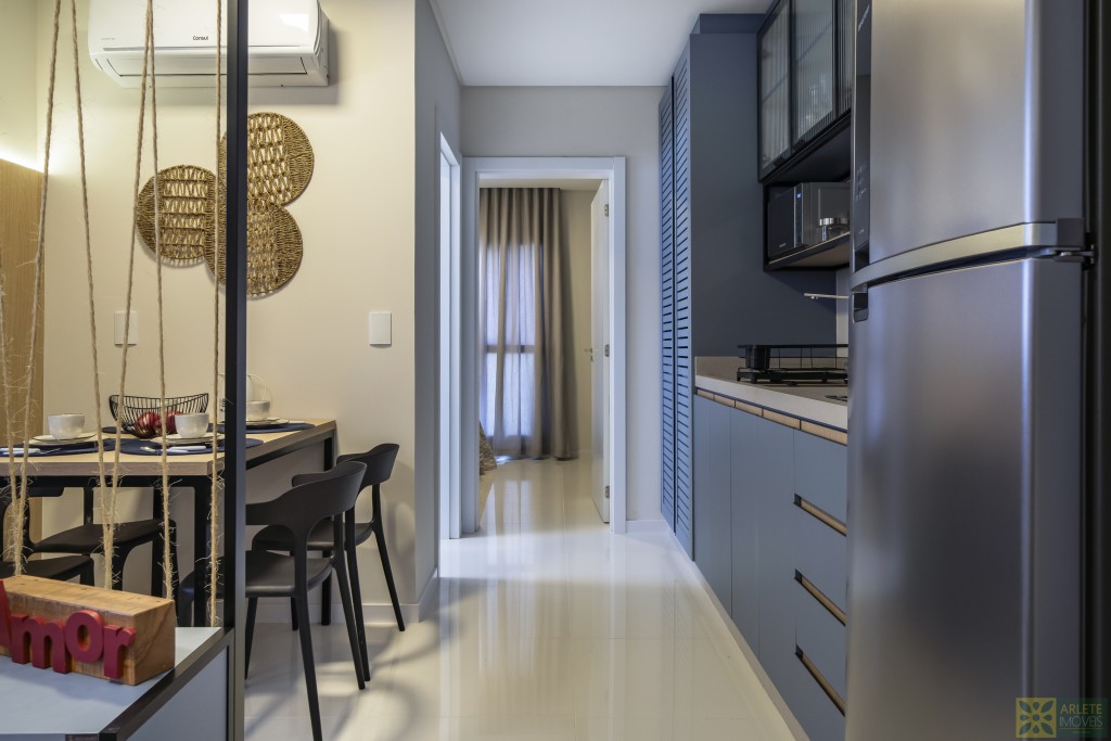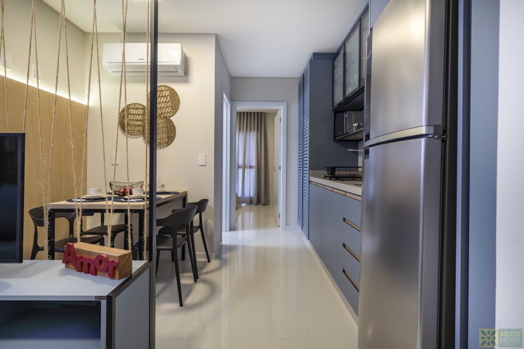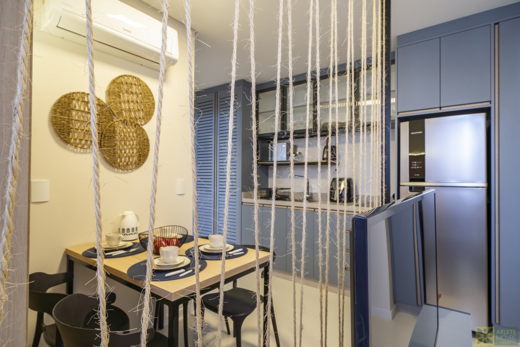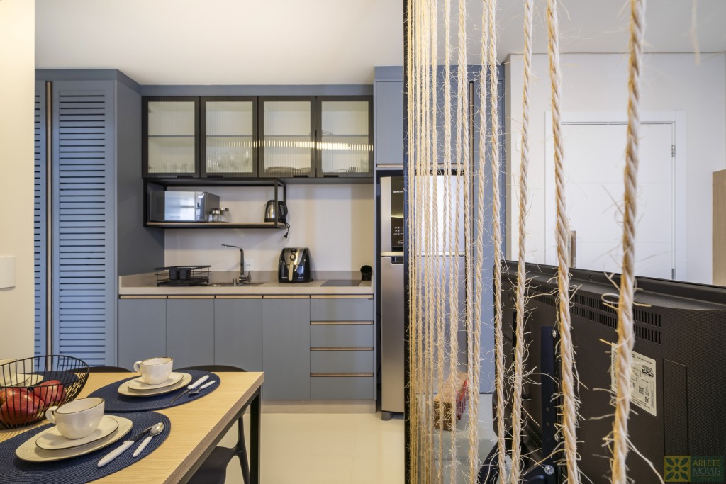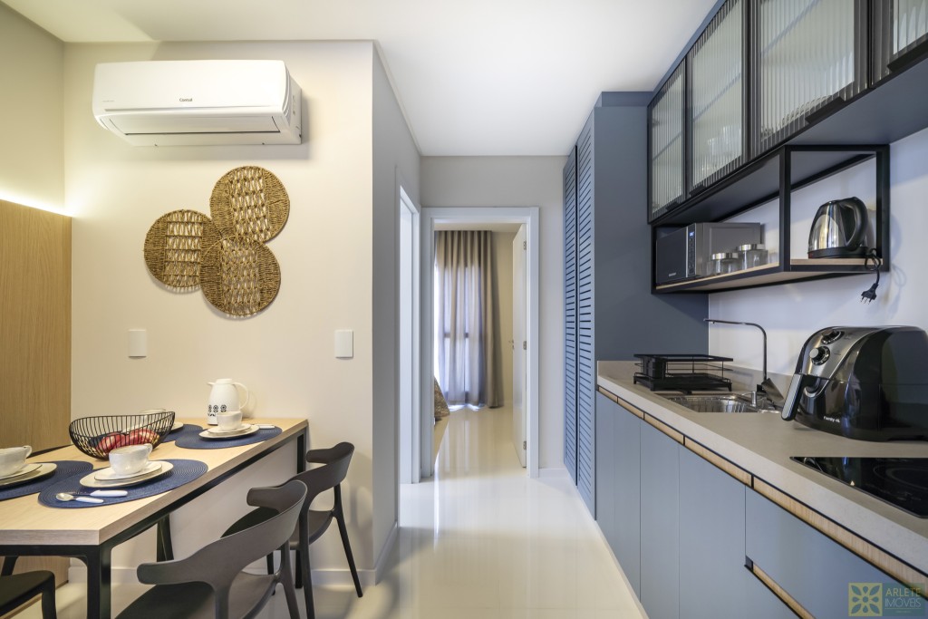 - Cozinha, sala de estar e jantar integradas em um único ambiente, com ar-condicionado split;