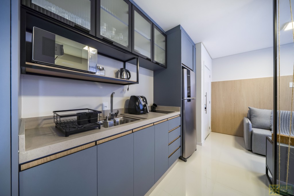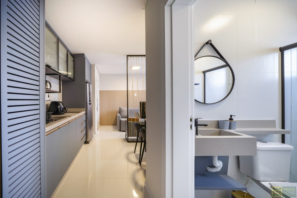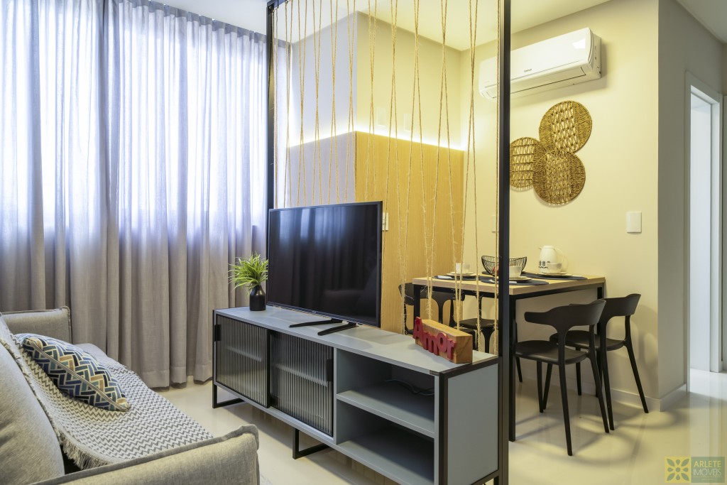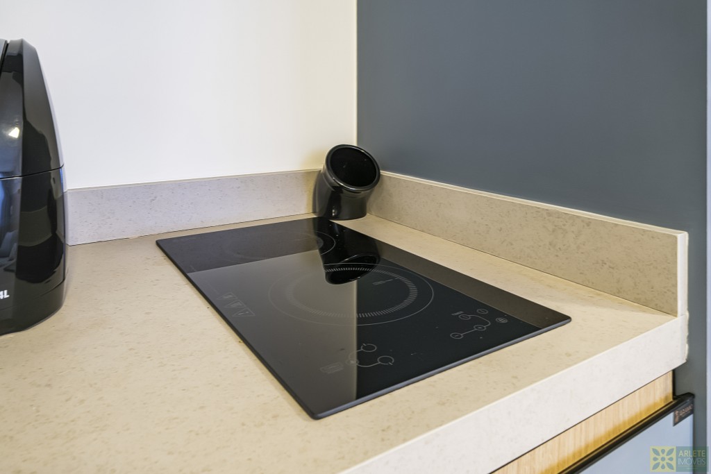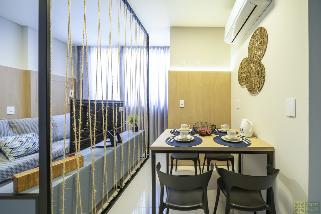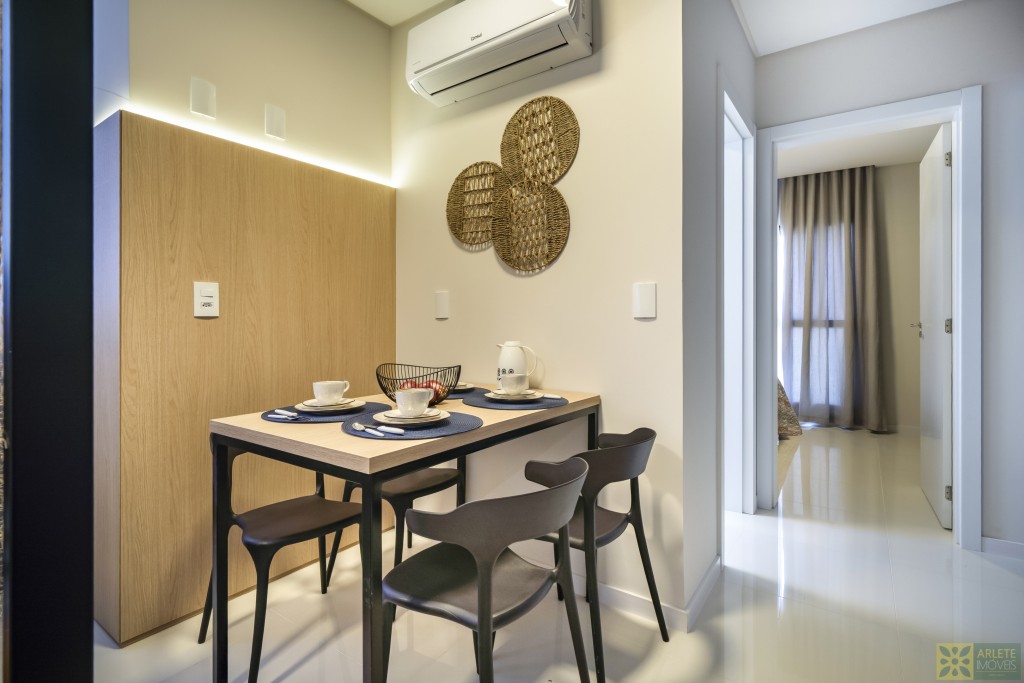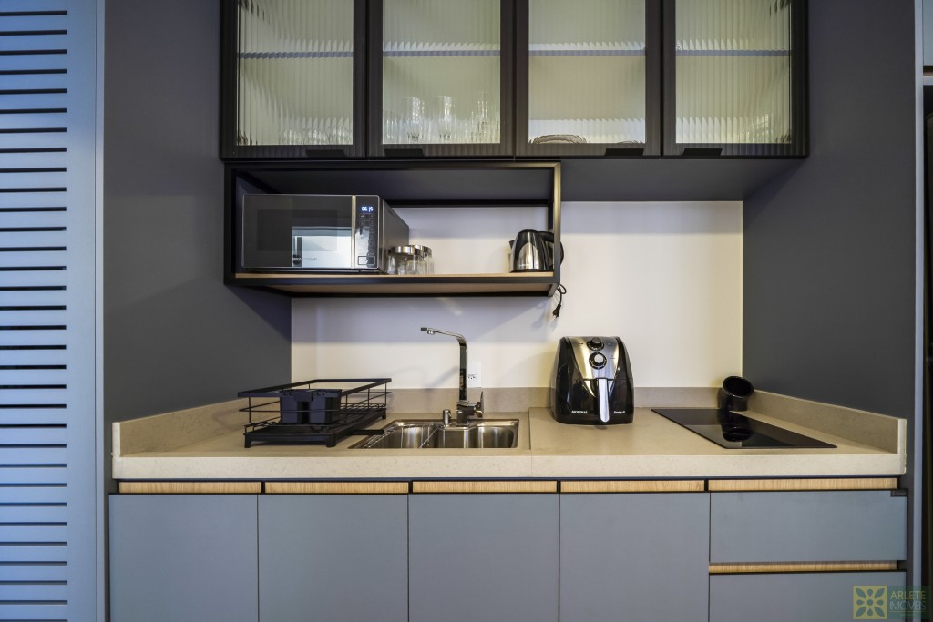 - Cozinha, sala de estar e jantar integradas em um único ambiente, com ar-condicionado split;
