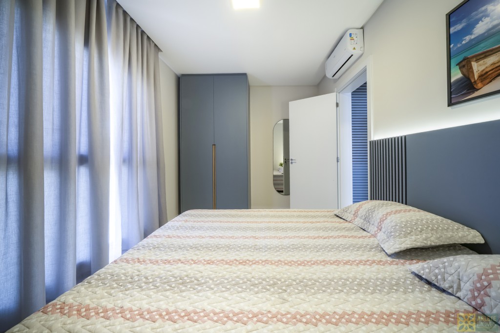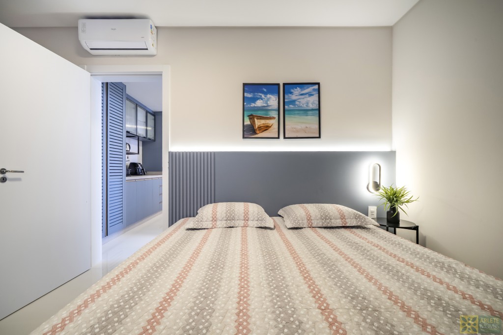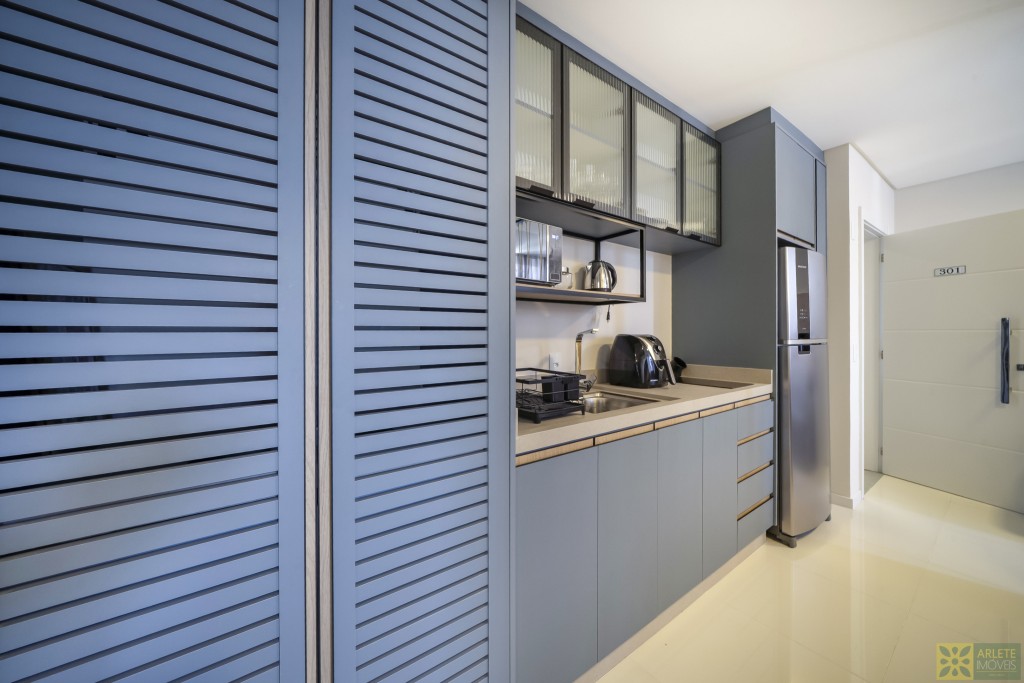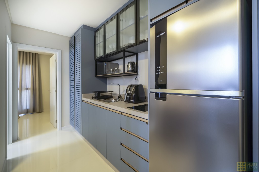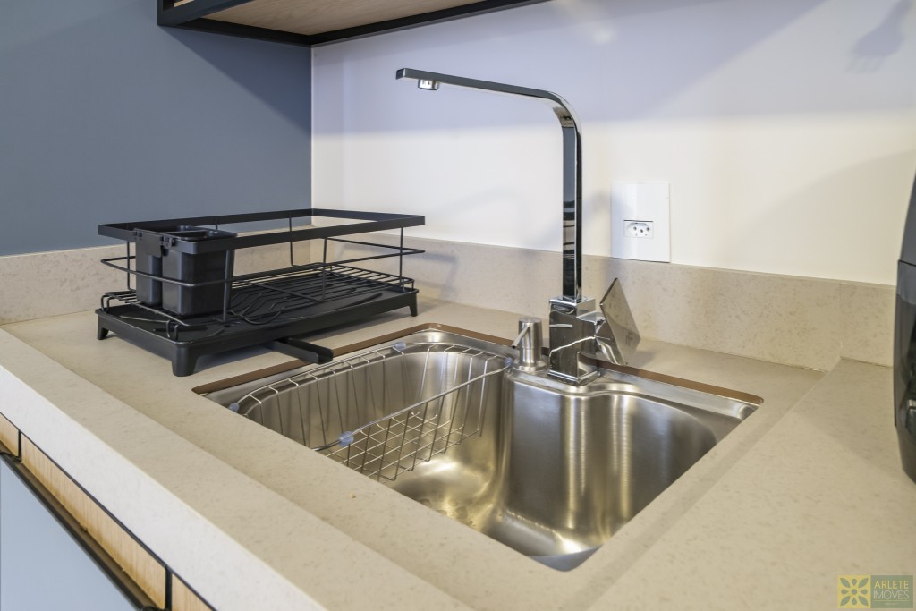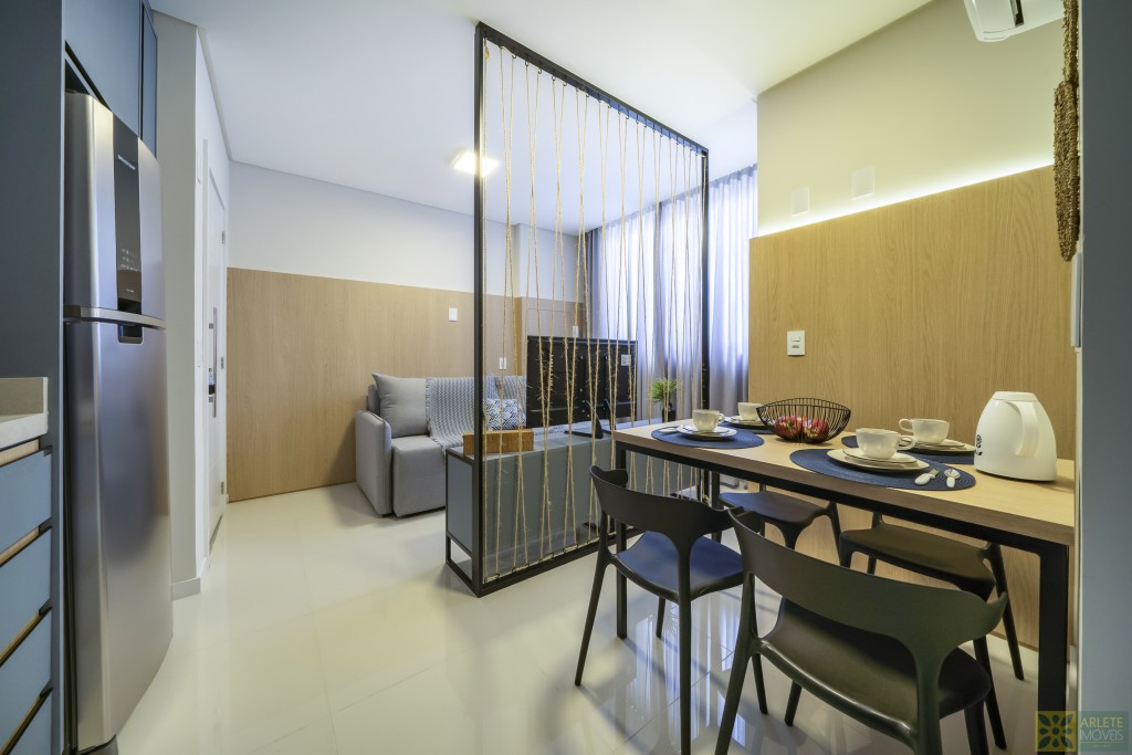 - Cozinha, sala de estar e jantar integradas em um único ambiente, com ar-condicionado split;